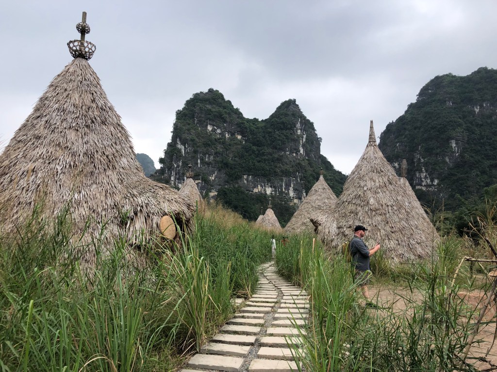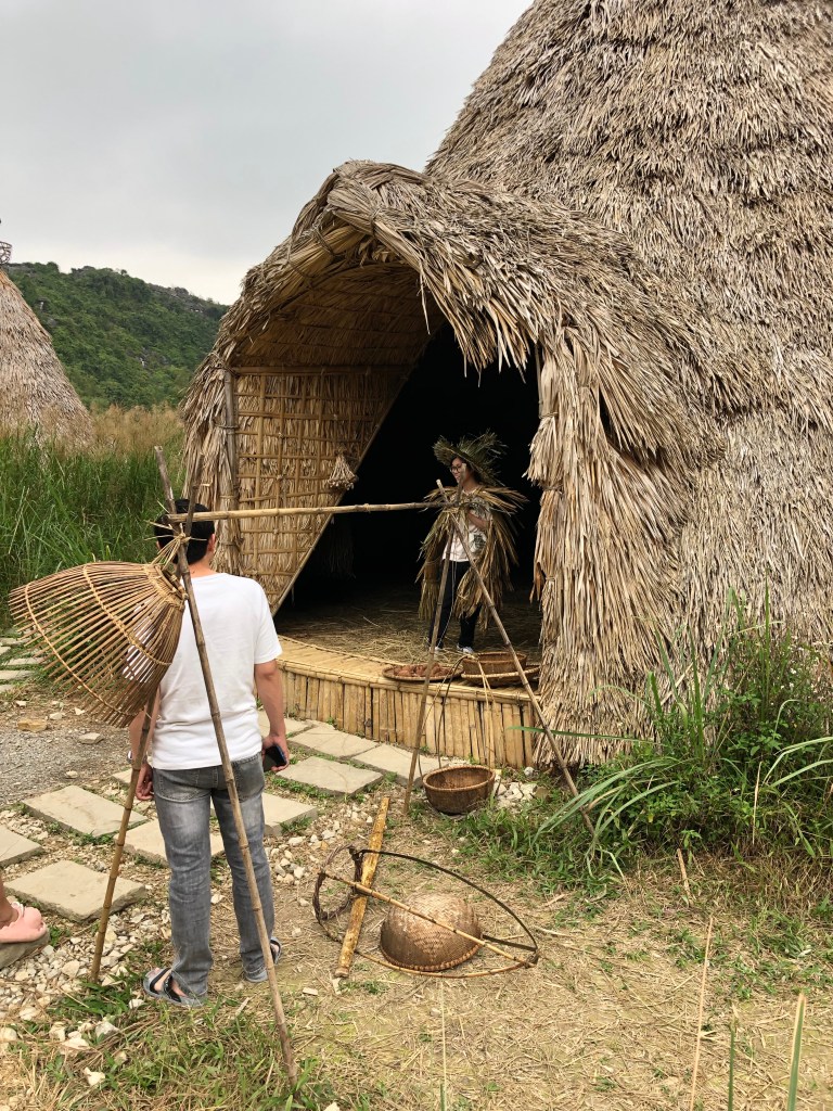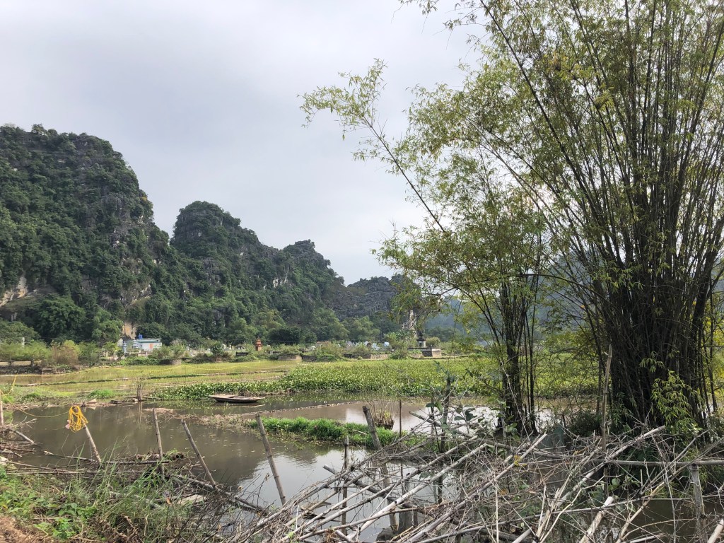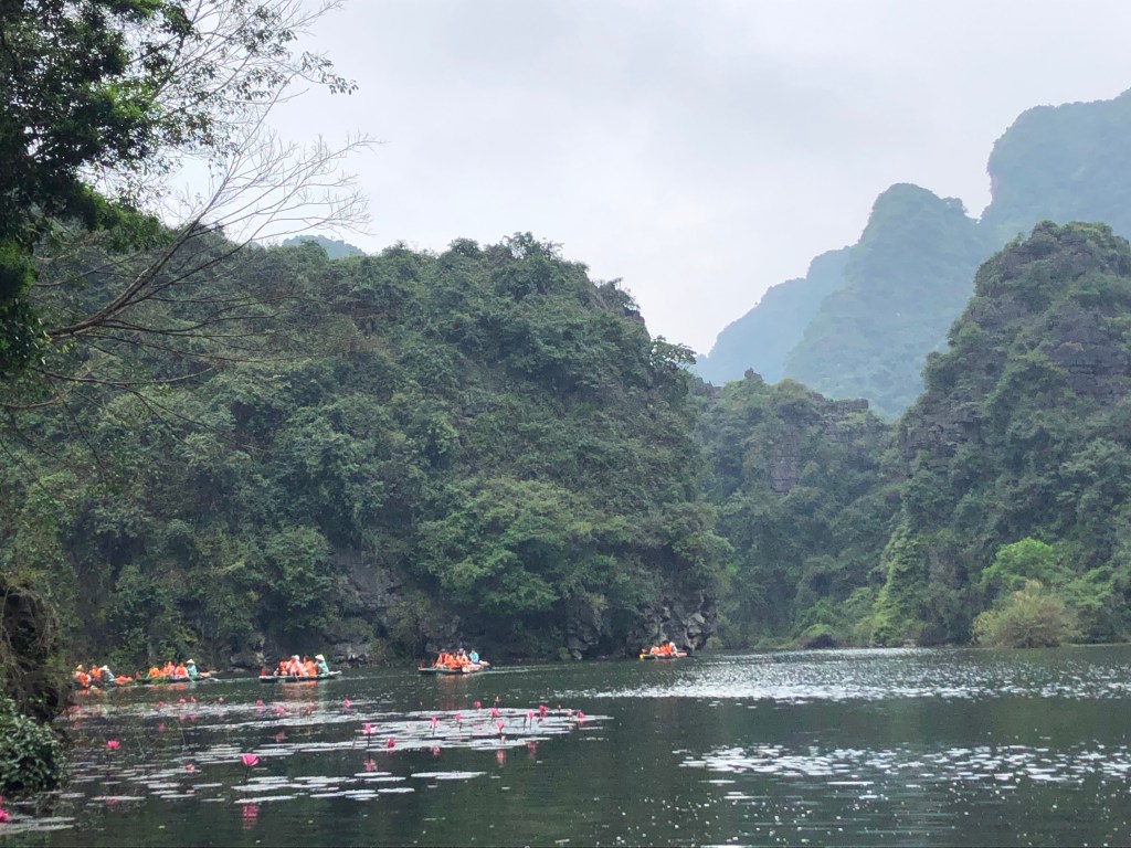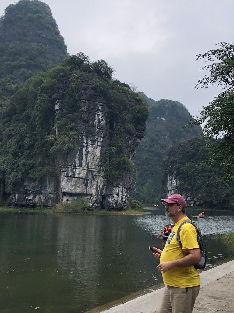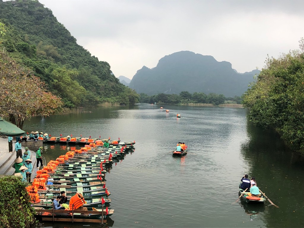 Bridge to Trang An complexPlenty boats ready for the rowboat toursUsually only 4 passengers per boatRiver leading to many cavesFirst of 5 temple stopsFirst cave – duck!Longer than expected. The exit of first cave. Many boats but 10 times more in summerLove the Karsts!Looking for our boat?Here’s another caveSome of thbeautiful temple adornments A different templeAnd again unique: entered 8+ temples doing 3 hour tourLast stop included example of ancient villageOur boar mates.