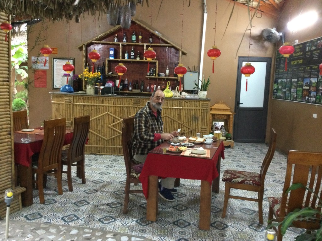 In the open air patio at our hotel Tamcoe Sky Bunglow our hosts provided us with a mixture of western and Vietnamese breakfast foods- I really enjoyed the rice noodles in a light broth and the fresh fruit slices. We both like the Vietnam strong cafe!