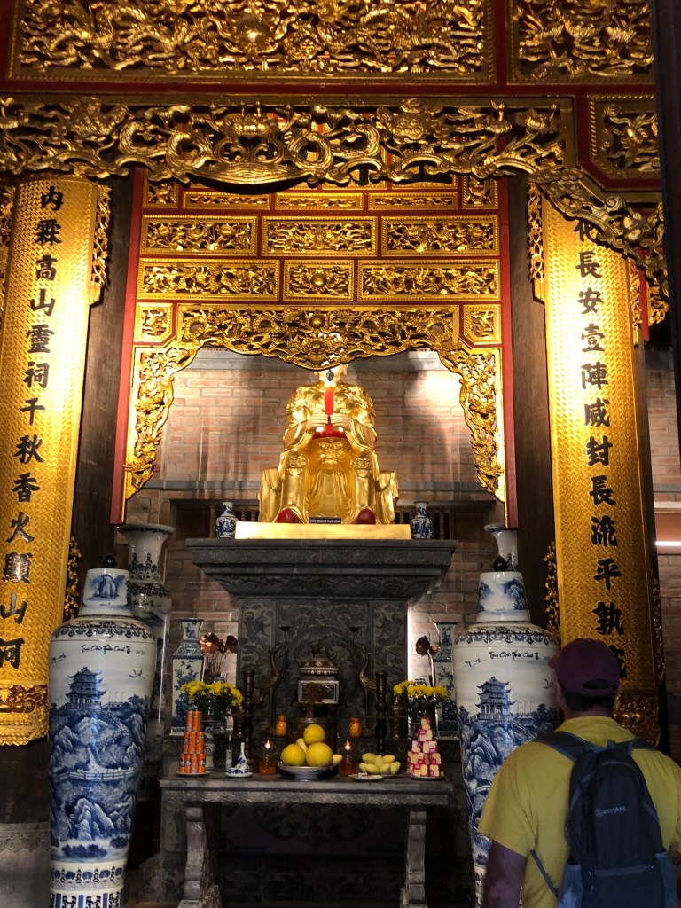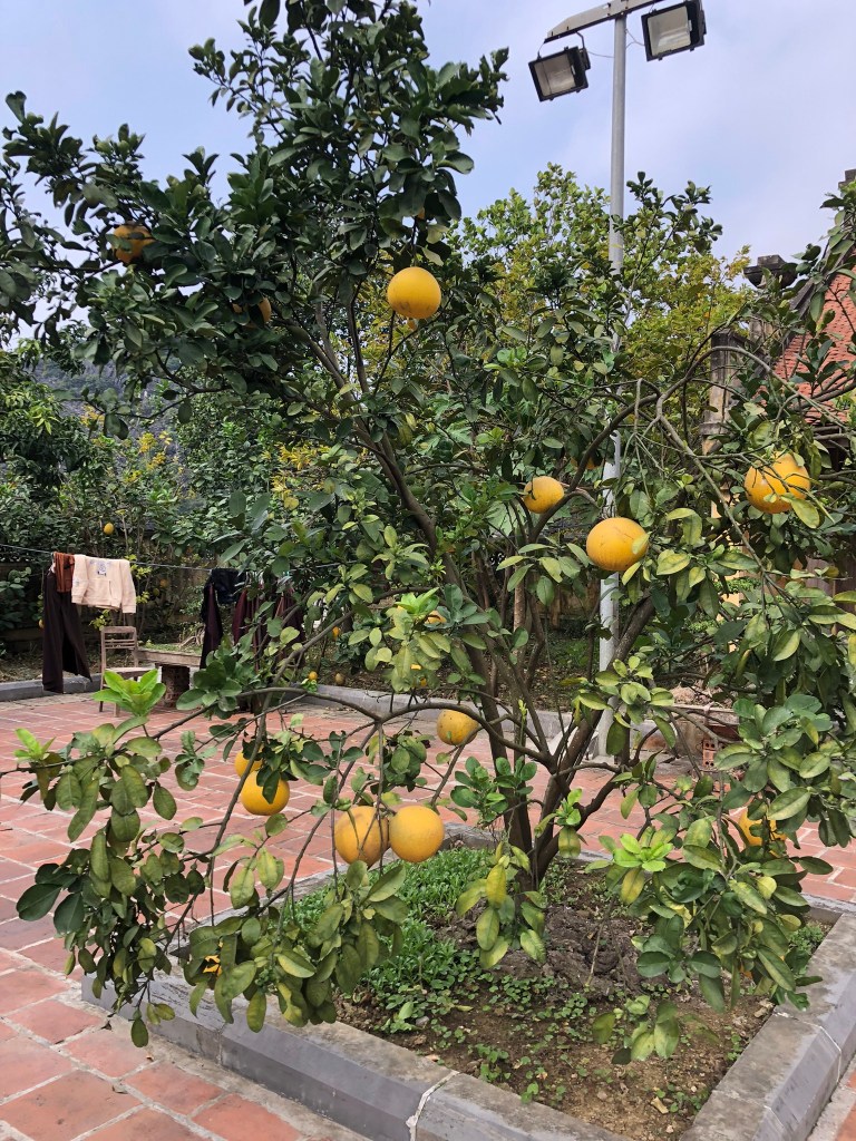 We explored the nearest temple and enjoyed feeding the fish in the temple area pond. Next we headed down a long road, past an ancient looking gate, and walked past rice fields and homes until we found another small temple area. The best part of visit was the fruit – pomelo – that we purchased from the woman in the temple entryway. She sat next us and showed us how to peel off the inner skin – she was very sweet and the pomelo was delicious.