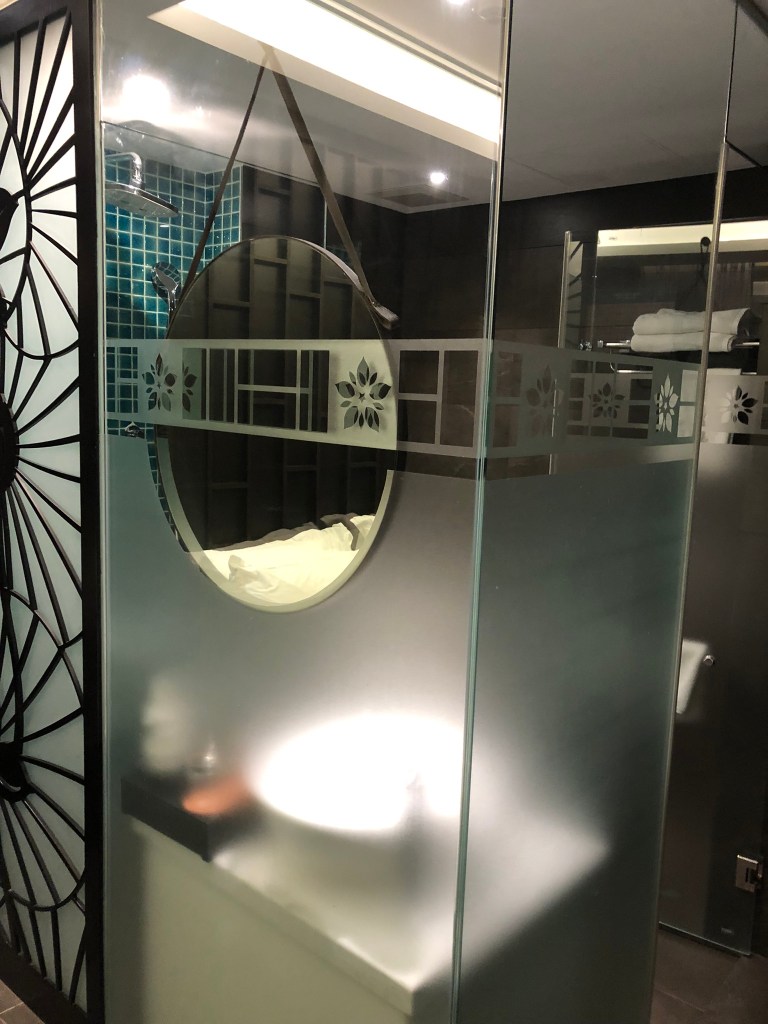 Very “elegent” room – but small Compact bathroomFloor to ceiling window – 14th floor so no one can see us- right?