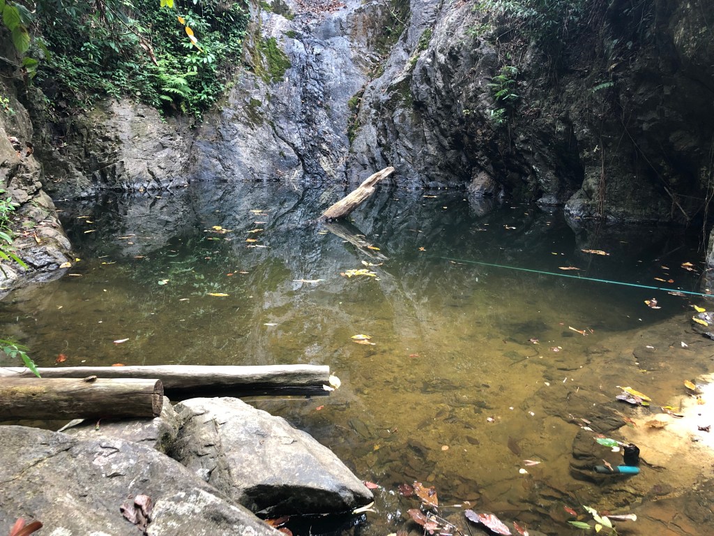 We moved to another hotel/resort (K B Resorts) further south but still with a sandy beach and another nearby waterfall! This waterfall was also dry except for trickles that still filled a cooling pool which we reached after following narrow, up and down trails for a while. Repelling was also required! The swim was refreshing and being damp helped us survive our next challenge – climbing a high steep hill to reach a cafe called “The Mount”.  It was beautiful up there with views of the mountains and ocean…